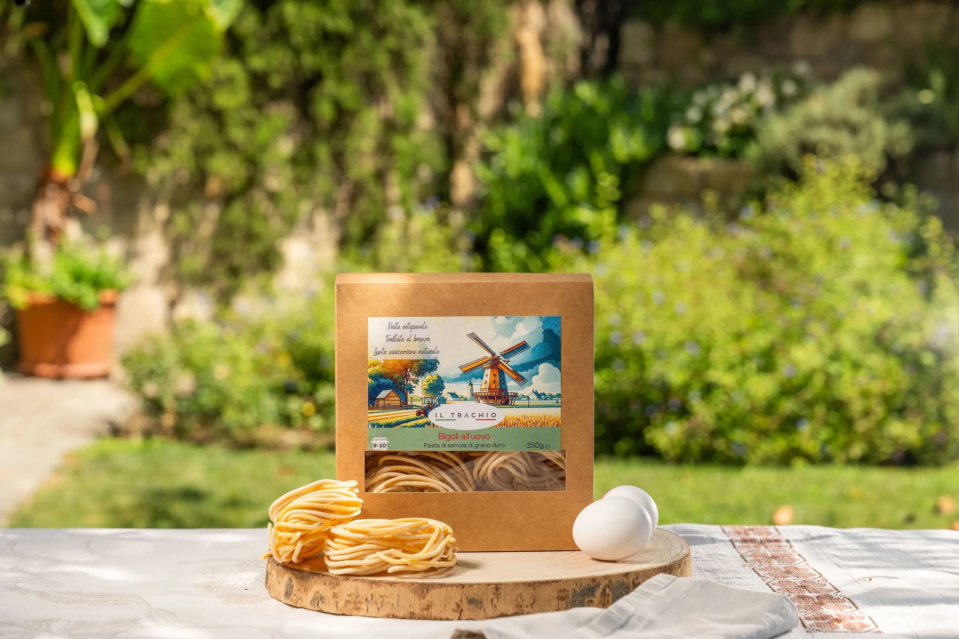 Porta sulla tua tavola i nostri Bigoli all'Uovo, una pasta tradizionale veneta realizzata con uova fresche di galline allevate a terra e farine di grano duro di alta qualità. I bigoli vengono trafilati al bronzo per ottenere una superficie ruvida che esalta i condimenti. L'essiccazione lenta a basse temperature preserva tutte le proprietà nutritive e il sapore autentico.