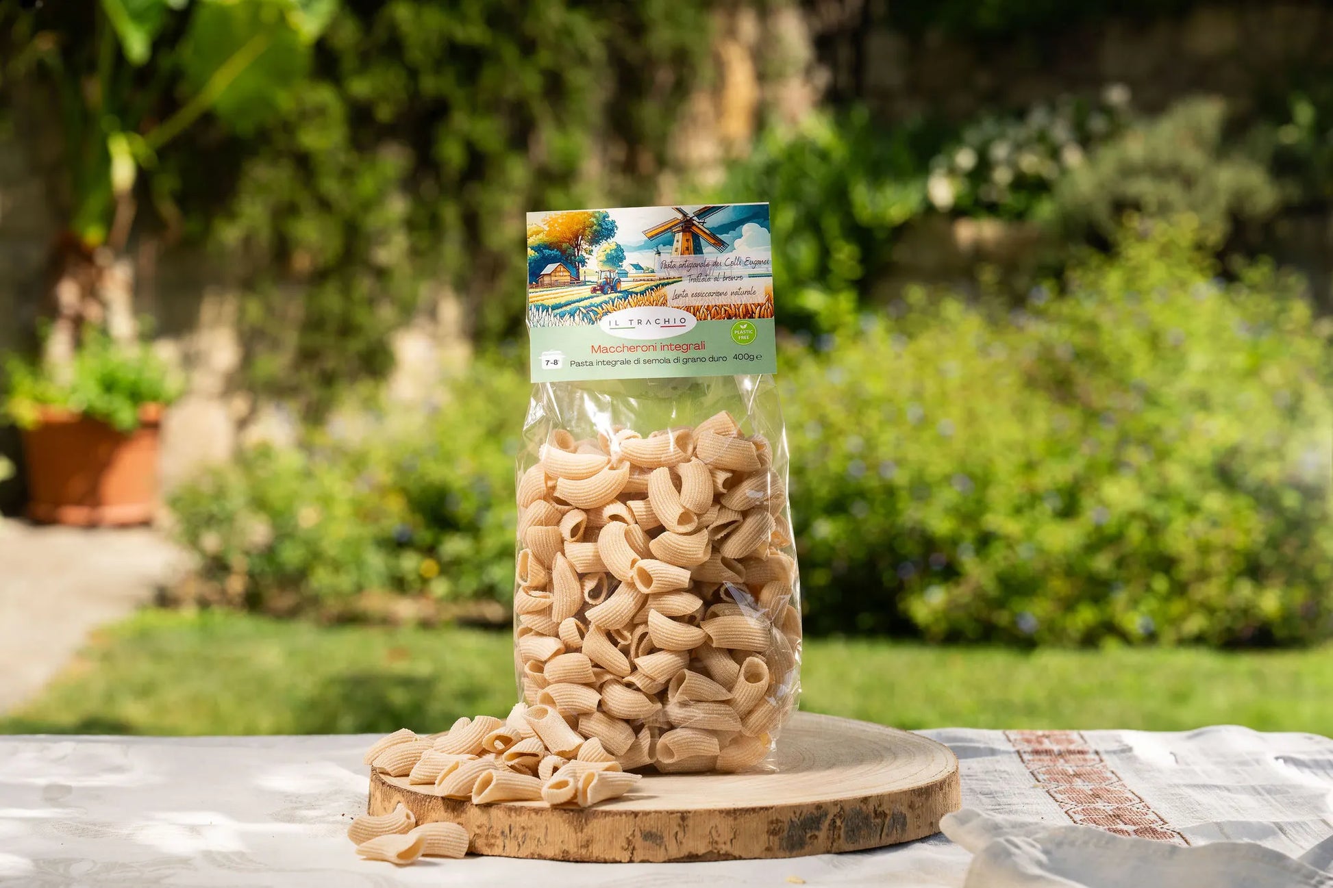 I nostri maccheroni integrali rappresentano l'incontro perfetto tra tradizione e benessere. Realizzati con semola integrale di grano duro, conservano tutte le parti del chicco, offrendo un alimento ricco di fibre, che favoriscono la digestione e aumentano il senso di sazietà. Pastificio Sorrentino GragnanoLa loro forma tubolare e la trafilatura al bronzo conferiscono una superficie ruvida, ideale per trattenere e valorizzare ogni tipo di condimento. L'essiccazione lenta a bassa temperatura preserva le qualità nutrizionali e il sapore autentico del grano, garantendo una pasta dal gusto intenso e dalla consistenza perfetta.Scegliere i nostri maccheroni integrali significa portare in tavola un prodotto artigianale, sano e saporito, perfetto per chi desidera un'alimentazione equilibrata senza rinunciare al piacere della buona cucina.